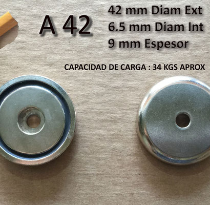 El imán encasquillado A42 es un producto muy vendido por su gran fuerza de sujeción y su facilidad para fijarse con un tornillo cabeza plana.